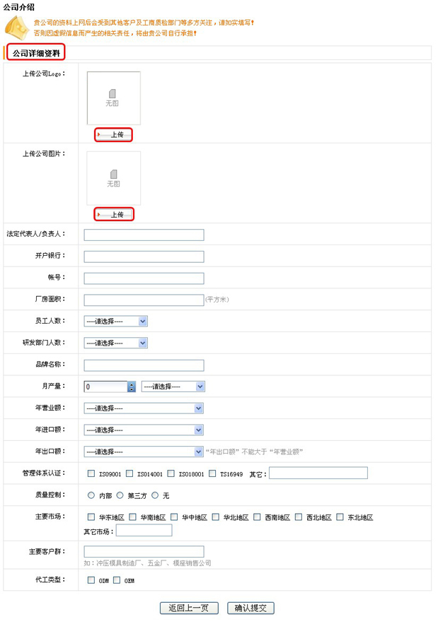 步骤四:在“公司详细资料”页面上传公司的logo,公司厂区或其它图片,填写相关项。